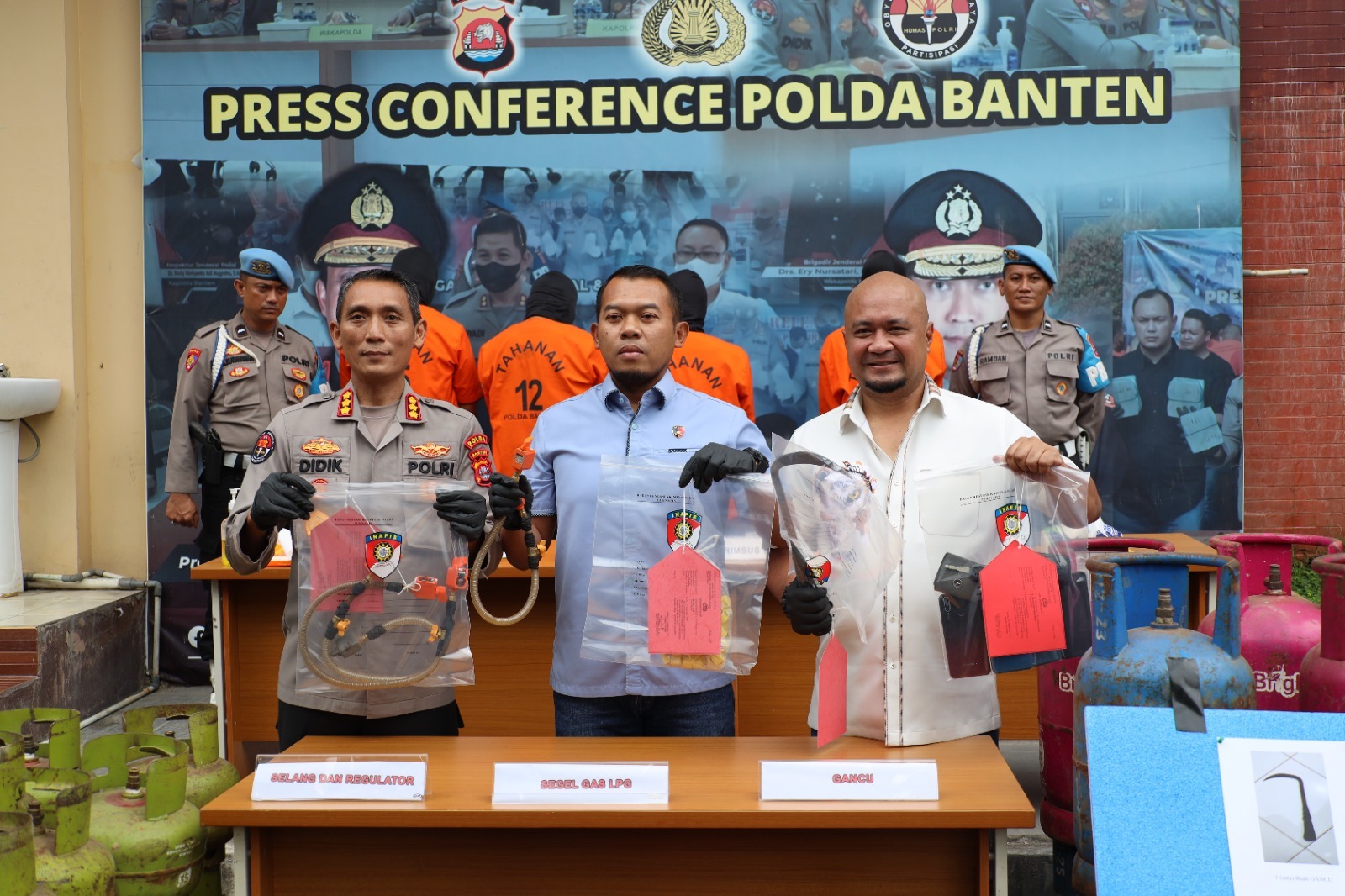 Dalam kesempatannya Kabid Humas Polda Banten Kombes Pol Didik Hariyanto menjelaskan bahwa Subdit IV Tipidter Ditreskrimsus Polda Banten telah berhasil mengamankan 4 pelaku pada Senin (11/09). “Ditreskrimsus Polda Banten telah menangkap 4 pelaku penyuntikan tabung gas LPG 3 Kg ke tabung gas LPG 12 Kg pada Senin (11/09) sekitar pukul 21.00 di Tanah Lapang yang beralamat di Perumahan Grean Royal Ds. Rangkasbitung Timur Kec. Rangkasbitung Kab. Lebak Prov. Banten. Para pelaku berinisial AR (37), EF (33), MM (55), dan MD (47) sedangkan Penyidik masih melakukan pengejaran terhadap 3 pelaku berinisial ST yang berperan sebagai Pemilik Kegiatan, BD sebagai Mandor Pengawas Lapangan, AN sebagai Pemodal Kegiatan,” kata Didik saat press conference.