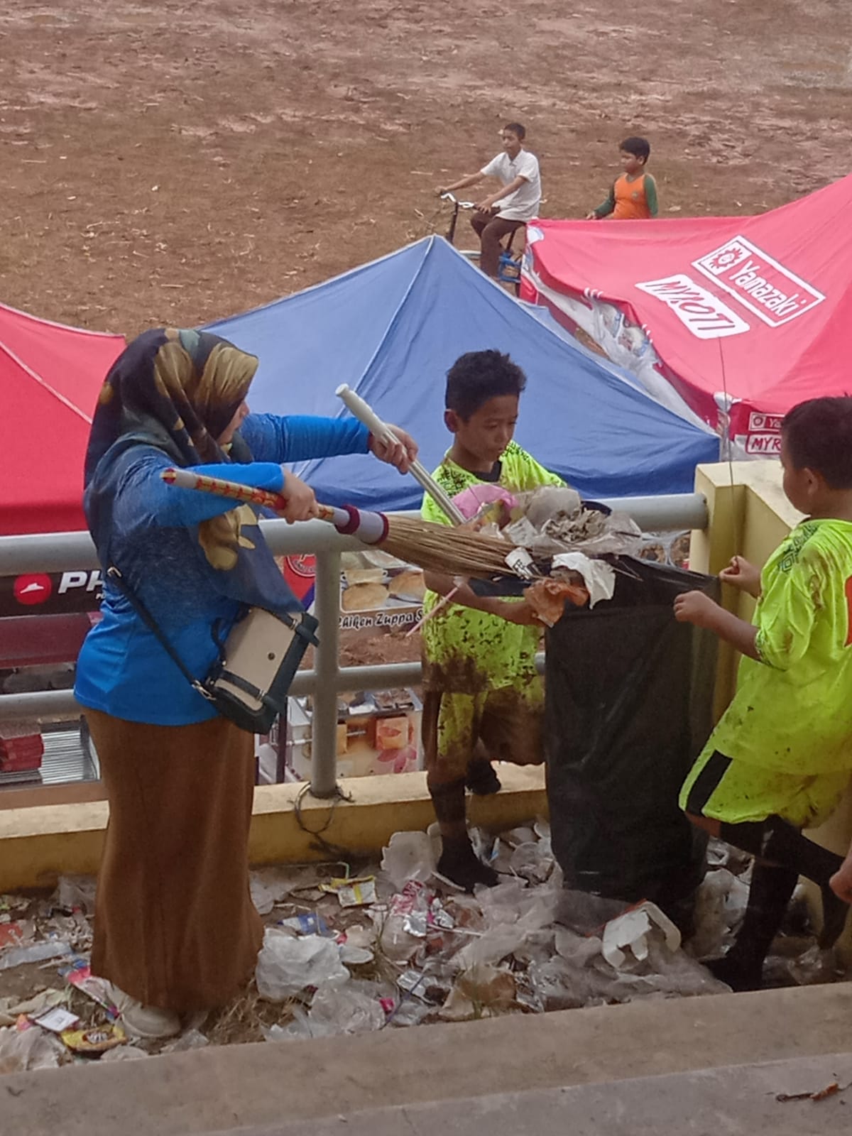 Ada pemandangan yang menarik hari ini di stadion mini Mustikajaya ini. Salah seorang cucu dari H. Natrom Nursyamsu yakni Nurhayati S.Pd tergerak hatinya melihat tumpukan sampah yang berserakan 3 hari pasca perhelatan akbar Festival Adu Beduk dan Ngarak Dondang untuk membersihkan seluruh sampah secara sukarela.