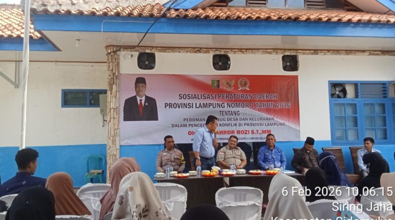 Kegiatan yang dimulai sekitar pukul 09.00 WIB ini dihadiri Bripka Hari Setia S, Bhabinkamtibmas Desa Siring Jaha, serta tokoh masyarakat, aparatur desa, dan warga setempat. Reses dipimpin oleh Fahror Rozi, S.T., M.M., anggota DPRD Provinsi Lampung, yang menyampaikan sosialisasi Peraturan Daerah Provinsi Lampung Nomor 1 Tahun 2026 tentang pedoman rembug desa dan kelurahan dalam upaya pencegahan konflik di Provinsi Lampung.