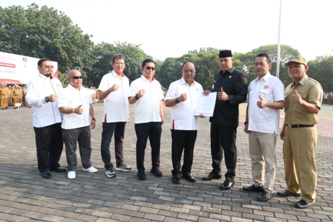 FAJARLAMPUNG.COM – Bekasi, Apel pada hari ini, Wali Kota Bekasi, Tri Adhianto yang juga sebagai Ketua KONI Kota Bekasi menerima surat keputusan dari Ketua KONI Pusat mengenai penunjukan Kota Bekasi sebagai tuan rumah Pekan Olahraga Bela Diri Nasional Tahun 2023.