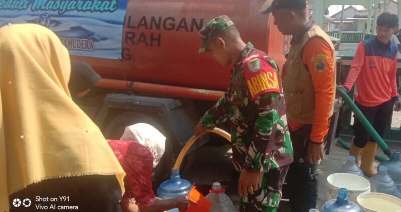 FAJARLAMPUNG.COM – Kota Serang, Bintara Pembina Desa (Babinsa) Koramil 0602-06/Kasemen Kodim 0602/Serang Kopral Satu (Koptu) Donny, membantu Bandan Penanggulangan Bencana Daerah (BPBD) Provinsi Banten, menyalurkan bantuan pasokan air bersih akibat terjadi kemarau yang disebabkan fenomena El Nino, di Lingkungan Kisalah Tiga Desa Kisalah Kecamatan Kasemen Kota Serang Provinsi Banten, Sabtu (16/09/2023).