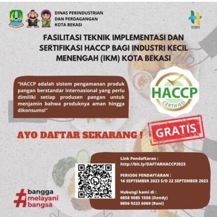 FAJARLAMPUNG.COM – Kota Bekasi, Bagi para pelaku Industri Kecil Menengah (IKM) di Kota Bekasi, Pemerintah Kota Bekasi melalui Dinas Perdagangan dan Perindustrian @disdagperin_kotabekasi, membuka Pendaftaran Fasilitasi Teknik Implementasi dan Sertifikasi HACCP (Hazard Analysis Critical Point), bagi Industri Kecil Menengah ( IKM ) pangan agar produk berstandar Internasional.