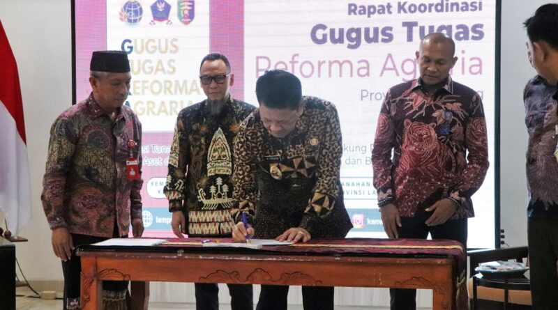 Rangkaian kegiatan dilanjutkan dengan penandatanganan Berita Acara Kesepahaman dan Kesepakatan Gugus Tugas Reforma Agraria (GTRA) Tahun 2025 oleh Pj. Sekdaprov M. Firsada, Kepala Kanwil BPN Provinsi Lampung, serta jajaran Forum Koordinasi Pimpinan Daerah (Forkopimda) Provinsi Lampung. (Sya)