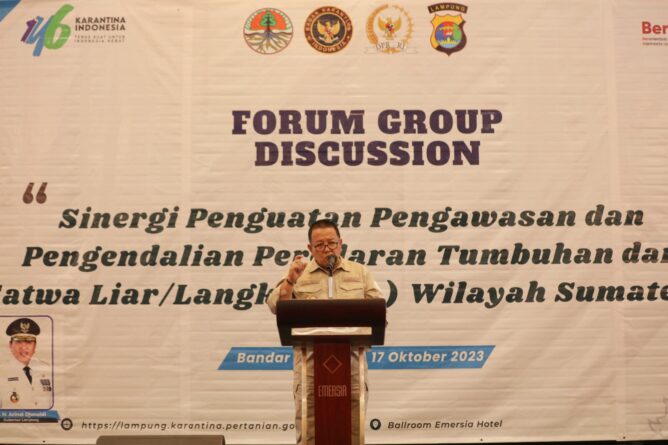 Hal itu disampaikan Gubernur saat membuka Focus Group Discussion (FGD) Sinergi Penguataan Pengawasan dan Pengendalian Peredaran TSL Wilayah Sumatera di Ballroom Hotel Emersia Bandar Lampung, Selasa (17/10/2023).