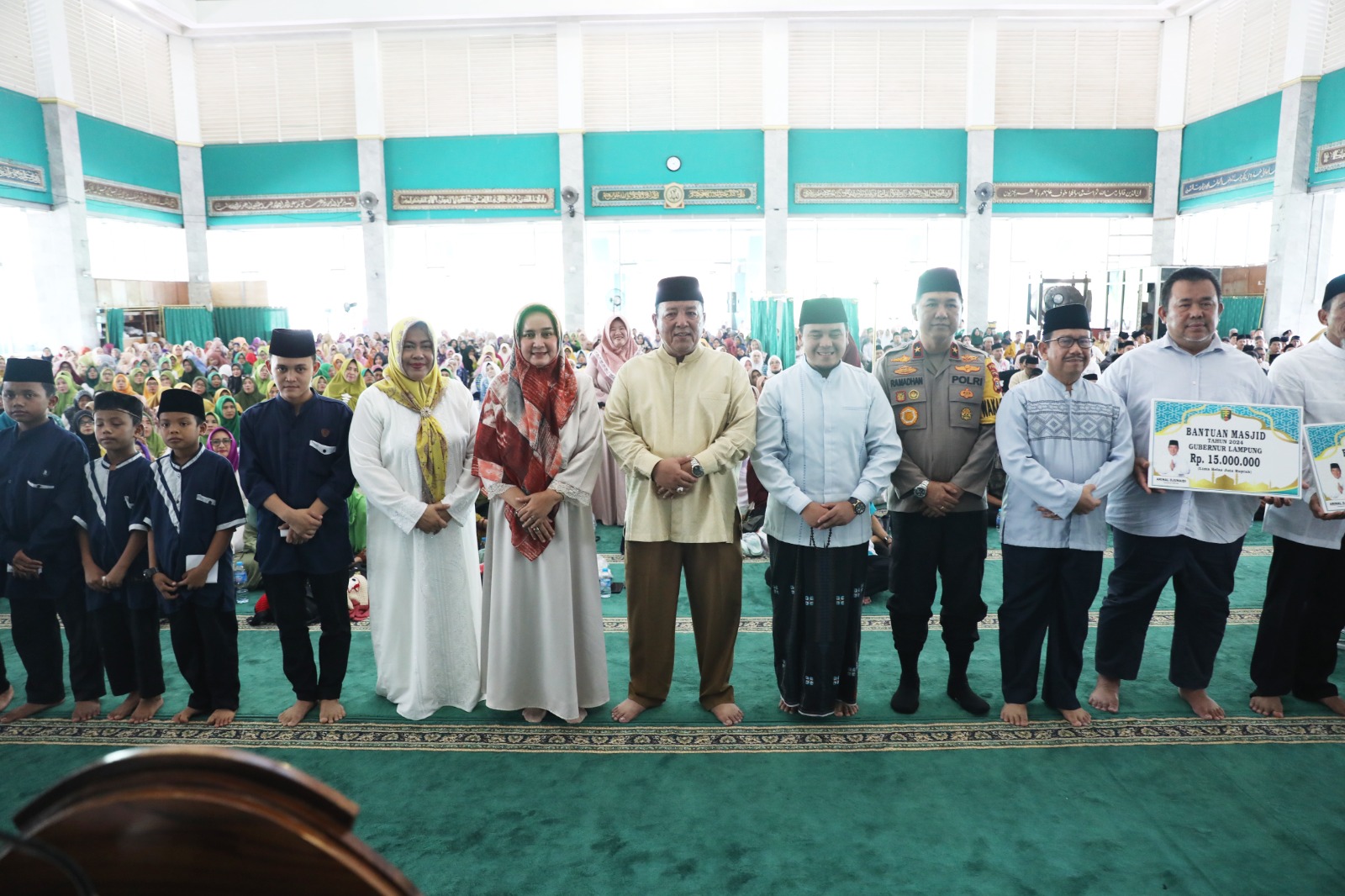 Dalam kesepatan itu, Gubernur Arinal menyerahkan santunan kepada anak yatim dan bantuan untuk Masjid Al-Iman, Masjid Al-Furqon Sepang Jaya, dan Masjid Jami’ Babul Jannah Jagabaya 3 Way Halim dengan masing-masing menerima bantuan sebesar Rp15 juta.