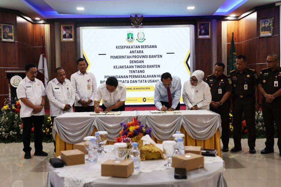 FAJARLAMPUNG.COM, Serang – Pemerintah Provinsi Banten dan Kejaksaan Tinggi (Kejati) Banten menjalin kesepakatan bersama tentang penanganan permasalahan hukum bidang perdata dan tata usaha negara. Penandatangan dilakukan oleh Penjabat (Pj) Gubernur Banten Al Muktabar dan Kepala Kejaksaan Tinggi (Kejati) Banten Siswanto di Aula Gedung Kejaksaan Tinggi Banten Lt. 2 Jln. Jaksa Agung R Suprapto Km. 6 Kelurahan Sukajaya Kecamatan Curug Kota Serang Banten, Rabu (28/8/2024).