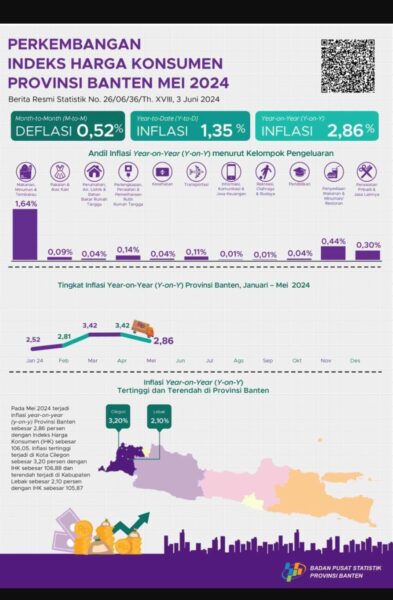 FAJARLAMPUNG.COM – Banten, Berdasarkan Berita Resmi Statistik No. 26/06/36/Th. XVIII, 3 Juni 2024 Badan Pusat Statistik (BPS) Provinsi Banten, inflasi year on year (y-on-y) Provinsi Banten pada Mei 2024 sebesar 2,86 persen dengan Indeks Harga Konsumen (IHK) sebesar 106,05. Mengalami penurunan dibandingkan bulan April 2024 yang mencapai 3,42 persen.