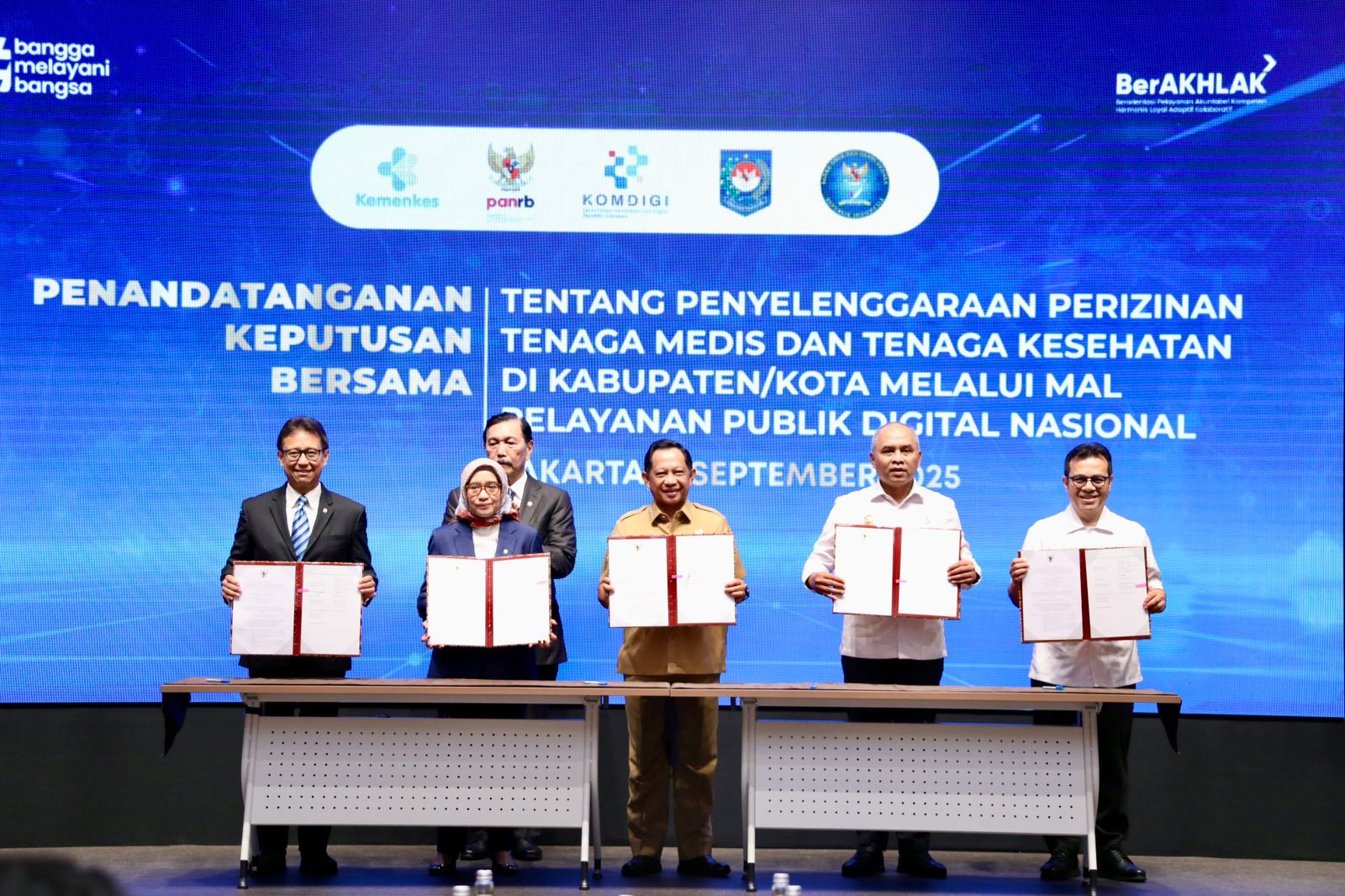 Usai sambutan, dilakukan penandatanganan Surat Keputusan Bersama oleh Mendagri, MenPAN-RB, Menteri Kesehatan, Wakil Menteri Komunikasi dan Digital, serta Kepala BSSN. Prosesi penandatanganan tersebut disaksikan langsung oleh Penasihat Khusus Presiden Bidang Digitalisasi dan Teknologi Pemerintahan Luhut Binsar Pandjaitan.(Nad)