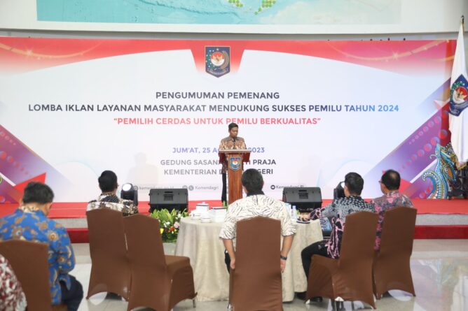 FAJARLAMPUNG.COM – Jakarta, Kementerian Dalam Negeri (Kemendagri) mengumumkan pemenang lomba iklan layanan masyarakat mendukung sukses Pemilu Tahun 2024 dengan tema “Pemilih Cerdas untuk Pemilu Berkualitas”. Acara yang digelar oleh Direktorat Jenderal (Ditjen) Politik dan Pemerintahan Umum (Polpum) Kemendagri tersebut dilaksanakan secara hybrid dari Gedung Sasana Bhakti Praja (SBP) Kantor Pusat Kemendagri, Jakarta, Jumat (25/8/2023).