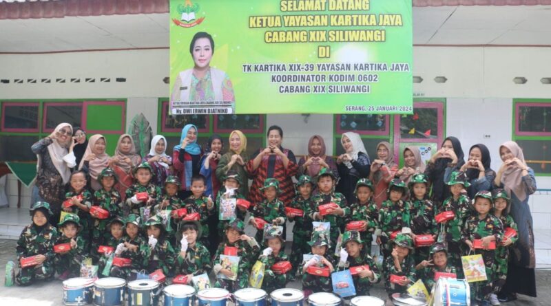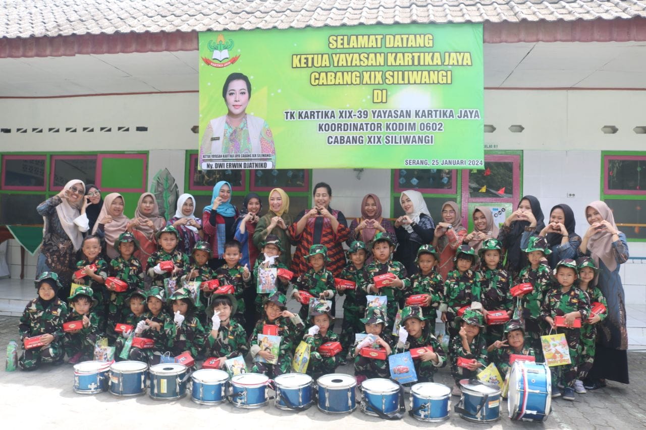 FAJARLAMPUNG.COM – Serang, Ketua Yayasan Kartika Jaya Cabang XIX Siliwangi Ny. Dwi Erwin Djatniko beserta rombongan mengunjungi dan memberikan bantuan sosial kepada anak anak murid di TK Kartika XIX-39 Yayasan Kartika Jaya Koordinator Kodim 0602/Serang Cabang XIX Siliwangi, Kamis (25/01/2024).