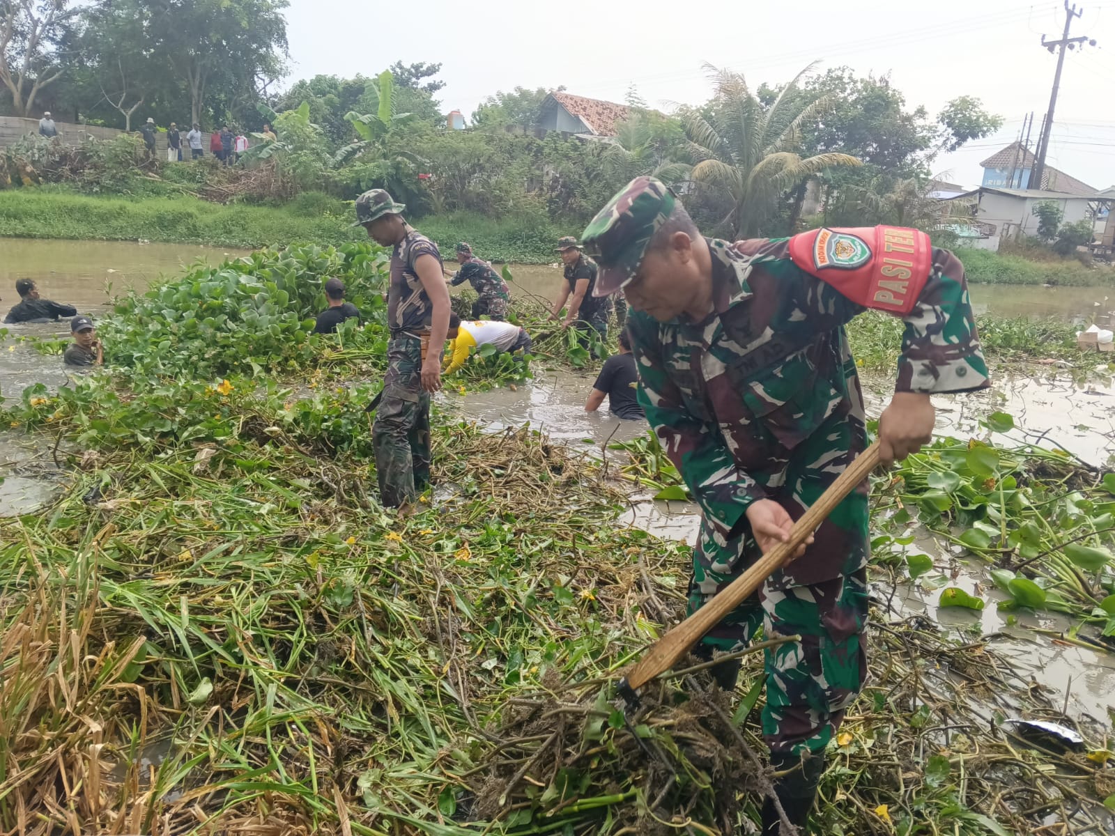 FAJARLAMPUNG.COM – Serang, Kodim 0602/Serang bekerjasama dengan puluhan anggota Komunitas KOPISUSU, dan DPUPR Kabupaten Serang bersama jajaran serta masyarakat sekitar melaksanakan kegiatan pembersihan sungai yang ditumbuhi rumput liar dan gulma lainnya di Sungai Ciwaka, Desa Kubang Puji, Kecamatan Pontang, Kabupaten Serang, Provinsi Banten, Jum’at (19/04/2024).