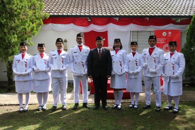 FAJARLAMPUNG.COM – Frankfurt, Jerman (17/08) – KJRI Frankfurt telah menyelenggarakan Upacara Peringatan Detik-detik Proklamasi Kemerdekaan ke-78 Republik Indonesia di Wisma Indonesia, Frankfurt am Main. Upacara pengibaran bendera dihadiri oleh tidak kurang dari 400 peserta yang terdiri dari masyarakat Indonesia maupun warga negara sahabat yang berasal dari 6 negara bagian di wilayah kerja KJRI Frankfurt. Pasukan pengibar bendera (Paskibra) KJRI Frankfurt merupakan putra-putri terbaik bangsa yang berdomisili di kota Frankfurt dan Darmstadt. Paskibra KJRI Frankfurt telah menjalani latihan secara intensif selama kurang lebih satu bulan. Bertindak sebagai Komandan Upacara Peringatan Detik-detik Proklamasi tahun ini adalah Mayor Laut (Pelaut) Herstyadi Sapto Condro.