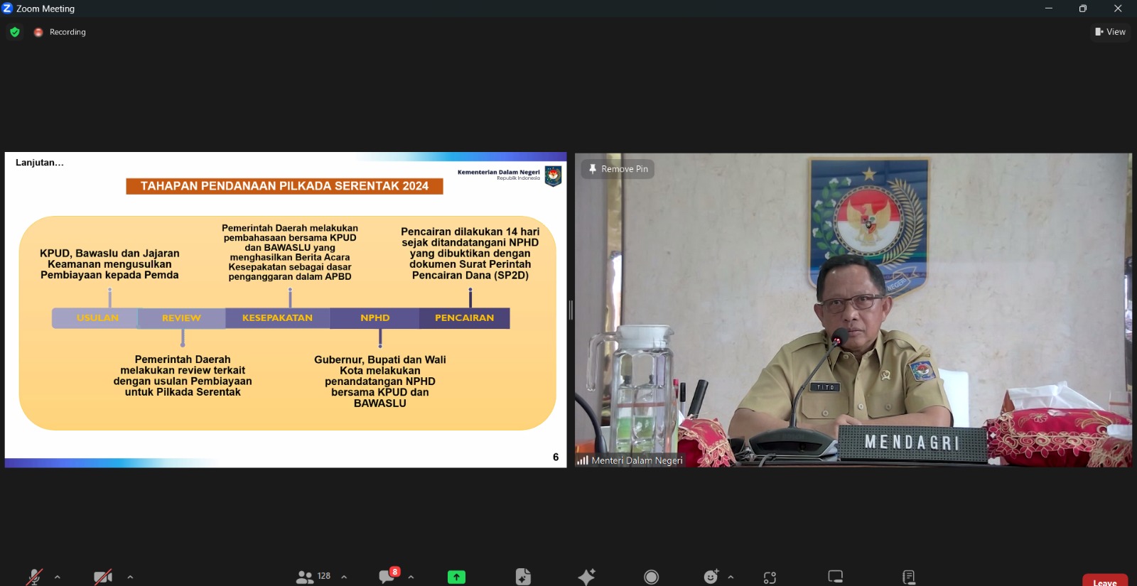 “Kemudian khusus untuk KPUD dan Bawaslu daerah itu saya sudah mengeluarkan surat (agar anggaran Pilkada) untuk dapat dicairkan 14 hari setelah penandatanganan naskah hibah (NPHD). Saya sudah mengeluarkan Surat Edaran mengingatkan tentang mekanisme ini itu pada (tanggal 24) Januari tahun 2023,” ujar Mendagri saat memimpin Rapat Koordinasi Percepatan Penandatanganan NPHD Kegiatan Pilkada Tahun 2024 Provinsi Sumatera Barat secara virtual dari Kantor Kementerian Dalam Negeri (Kemendagri), Selasa (28/11/2023).