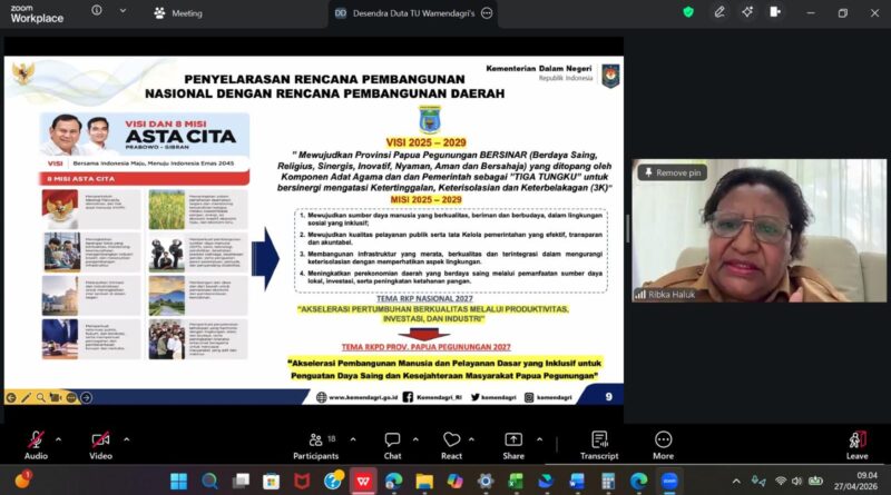 FAJARLAMPUNG.COM, Jakarta — Wakil Menteri Dalam Negeri (Wamendagri) Ribka Haluk menegaskan pentingnya sinkronisasi dan konsistensi perencanaan pembangunan antara pemerintah pusat dan daerah. Hal tersebut disampaikannya secara daring dalam Musyawarah Perencanaan Pembangunan (Musrenbang) Rencana Kerja Pemerintah Daerah (RKPD) Provinsi Papua Pegunungan Tahun 2027 dari Jakarta, Senin (27/4/2026).