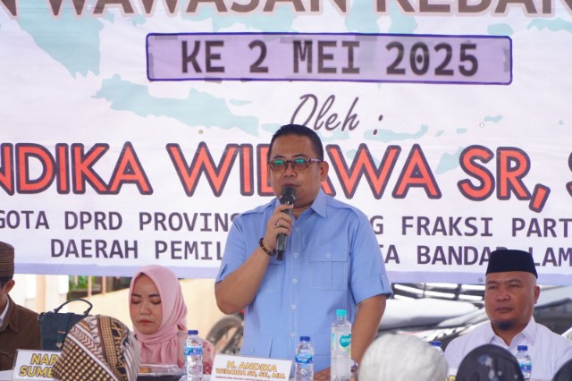 FAJARLAMPUNG.COM, Bandar Lampung – Anggota DPRD Provinsi Lampung dari Fraksi Gerindra, Andika Wibawa, kembali menegaskan pentingnya penguatan ideologi Pancasila di tengah derasnya arus ideologi asing yang berpotensi memecah belah bangsa. Hal ini disampaikannya dalam kegiatan Pembinaan Ideologi Pancasila dan Wawasan Kebangsaan (PIPWK) ke-2 yang digelar di daerah Kota Baru, Kecamatan Tanjung Karang Timur, Minggu (25/5).
