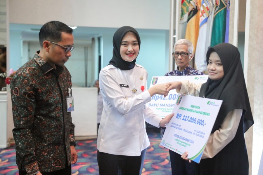 Santunan dan Beasiswa juga diserahkan secara simbolis kepada keluarga penerima manfaat, termasuk beasiswa bagi anak pekerja yang meninggal dunia. BPJS Ketenagakerjaan mencatat ratusan anak di Lampung telah menerima beasiswa hingga 174 juta untuk pendidikan dari SD hingga perguruan tinggi.