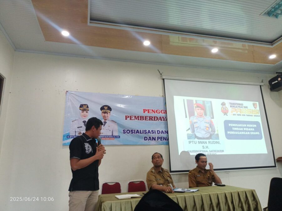 Sebagai narasumber utama, perwakilan dari Polres Serang memberikan paparan mendalam terkait modus, dampak, serta langkah-langkah hukum dalam penanganan TPPO, sekaligus menekankan pentingnya peran pemerintah desa dan masyarakat dalam mendeteksi dini potensi kejahatan tersebut.