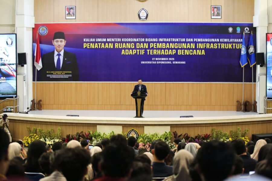 FAJARLAMPUNG.COM, Semarang — Menteri Koordinator Bidang Infrastruktur dan Pembangunan Kewilayahan, Agus Harimurti Yudhoyono (AHY), menegaskan pentingnya kolaborasi antara pemerintah dan perguruan tinggi dalam membangun infrastruktur yang tangguh dan adaptif terhadap bencana. Hal tersebut disampaikannya dalam Kuliah Umum bertema “Penataan Ruang dan Pembangunan Infrastruktur Adaptif Terhadap Bencana” di Universitas Diponegoro (Undip), Semarang, Kamis (27/11/2025).