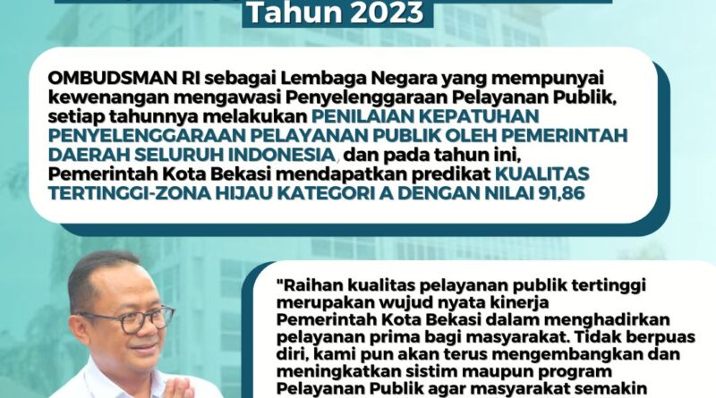 FAJARLAMPUNG.COM – Kota Bekasi, OMBUDSMAN RI sebagai Lembaga Negara yang mempunyai kewenangan mengawasi Penyelenggaraan Pelayanan Publik, setiap tahunnya melakukan Penilaian Kepatuhan Penyelenggaraan Pelayanan Publik oleh Pemerintah Daerah Seluruh Indonesia, dan pada tahun ini, Pemerintah Kota Bekasi mendapatkan predikat KUALITAS TERTINGGI-ZONA HIJAU KATEGORI A DENGAN NILAI 91,86.