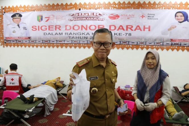 FAJARLAMPUNG.COM – Bandar Lampung, Pemerintah Provinsi Lampung bersama PMI menggelar kegiatan Siger Donor Darah dalam rangka menyambut Hari Ulang Tahun Republik Indonesia (HUT RI) ke-78, di Gedung Balai Keratun Ruang Abung, Kompleks Kantor Gubernur, Bandarlampung, Senin (15/08/2023).