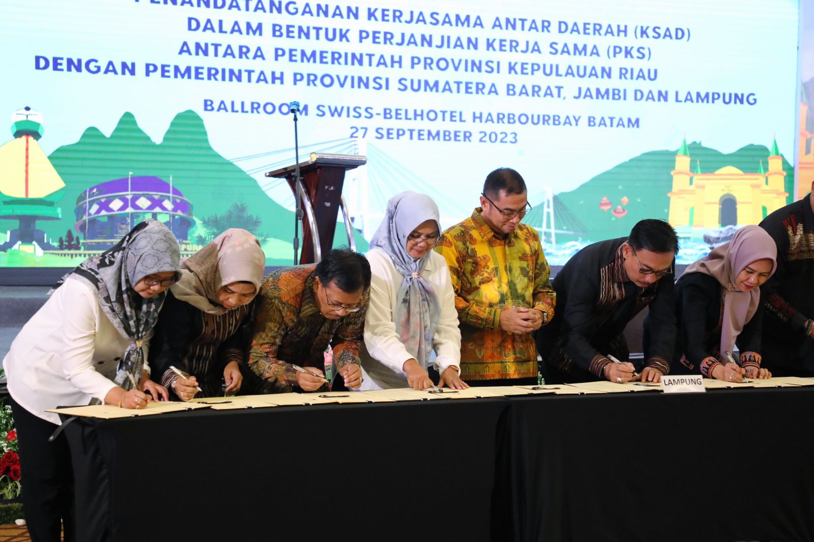 FAJARLAMPUNG.COM – Batam, Pemerintah Provinsi Lampung mengadakan Penandatanganan Perjanjian Kerjasama dengan Pemerintah Provinsi Kepulauan Riau (Kepri) di Ballroom Swiss-Bel Hotel Harbour Bay, Kota Batam, Rabu (27/9/2023).