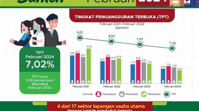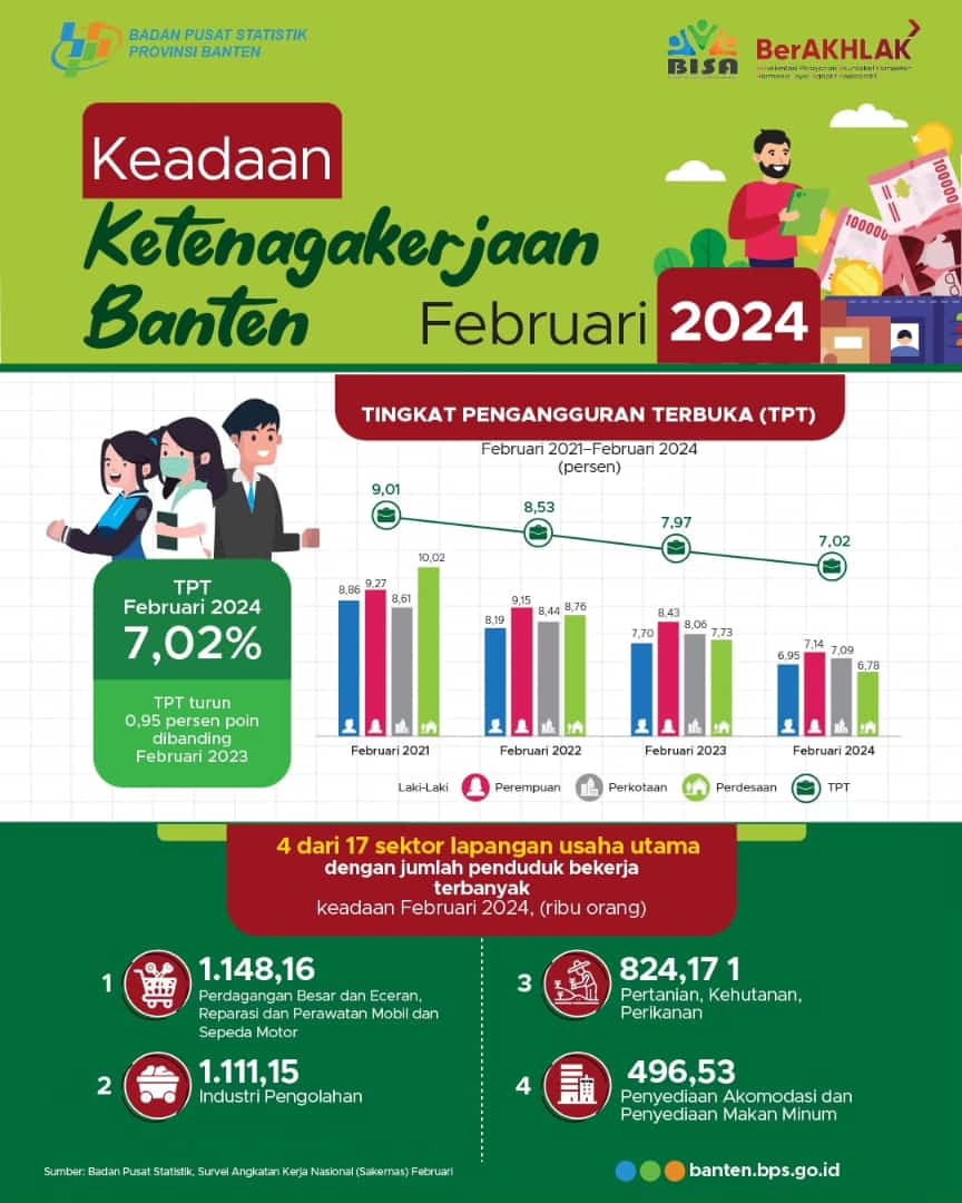 FAJARLAMPUNG.COM – Banten, Berdasarkan Berita Statistis Badan Pusat Statistik Provinsi Banten pada Senin,(6/5/2024), Tingkat Pengangguran Terbuka (TPT) Provinsi Banten mengalami tren penurunan. dari periode Agustus 2020 hingga Februari 2024. Akibat pandemi covid-19, TPT Provinsi Banten sempat sentuh 10,64 persen. Seiring meningkatnya aktivitas produksi, TPT Provinsi Banten kini di angka 7,02 persen.
