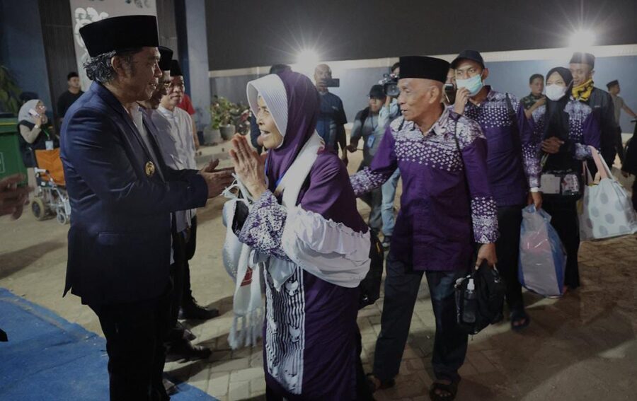 FAJARLAMPUNG.COM – Tangerang, Penjabat (Pj) Gubernur Banten Al Muktabar menyambut kedatangan jamaah haji Provinsi Banten Kelompok Terbang 02 asal Kota Tangerang di Grand El Hajj Asrama Haji Provinsi Banten, Cipondoh, Kota Tangerang, Sabtu (22/6/2024) malam. Sekitar Pukul 23.00 WIB, jamaah tiba di Asrama Haji Provinsi Banten.