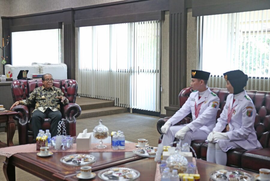 FAJARLAMPUNG.COM, Bandar Lampung – Usai menjalankan tugas sebagai Paskibraka pada perayaan Hari Kemerdekaan ke-79 di Ibu Kota Nusantara (IKN), Alvin Febian Siagian siswa SMAN 2 Bandar Lampung dan Mutia Al Vanie siswi SMAN 1 Kota Gajah berkunjung ke Pj. Gubernur Lampung Samsudin, di Ruang Kerja Gubernur, Bandarlampung, Jum’at (6/9/2024).