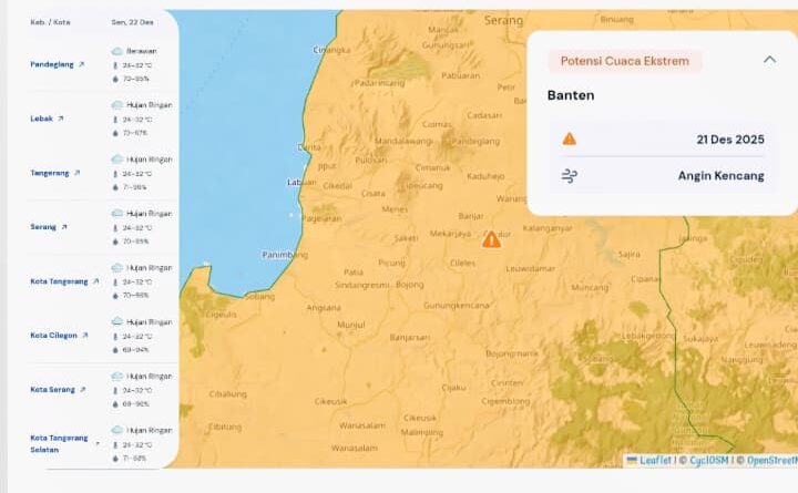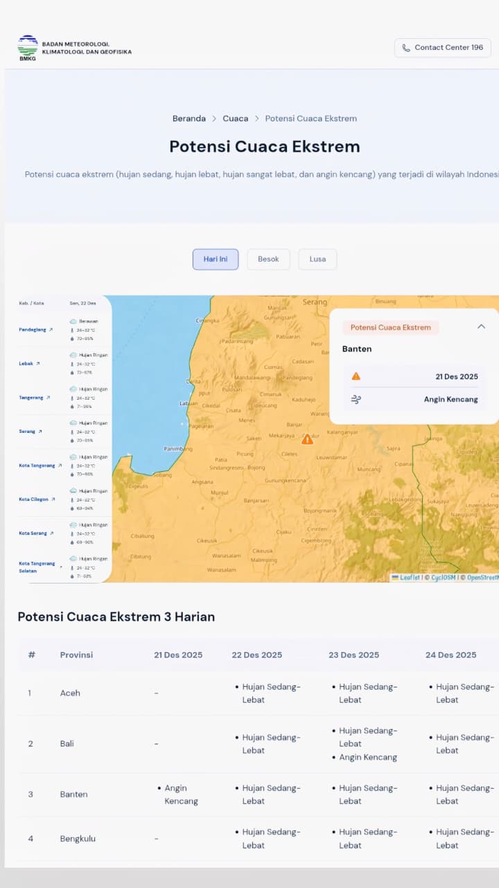 FAJARLAMPUNG.COM, Serang – Polda Banten kembali mengimbau masyarakat untuk meningkatkan kewaspadaan terhadap potensi cuaca tidak menentu berdasarkan pembaruan informasi dari Badan Meteorologi, Klimatologi, dan Geofisika (BMKG) Banten pada Senin (22/12).