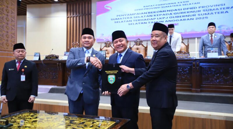 FAJARLAMPUNG.COM, Palembang – Gubernur Sumatera Selatan, Dr. H. Herman Deru, bersama Wakil Gubernur H. Cik Ujang menghadiri Rapat Paripurna XXXIII (33) DPRD Provinsi Sumatera Selatan dengan agenda penyampaian rekomendasi DPRD terhadap Laporan Keterangan Pertanggungjawaban (LKPJ) Tahun Anggaran (TA) 2025, Senin (27/4). Dalam rapat tersebut, DPRD secara resmi menerima dan menyetujui LKPJ Gubernur.