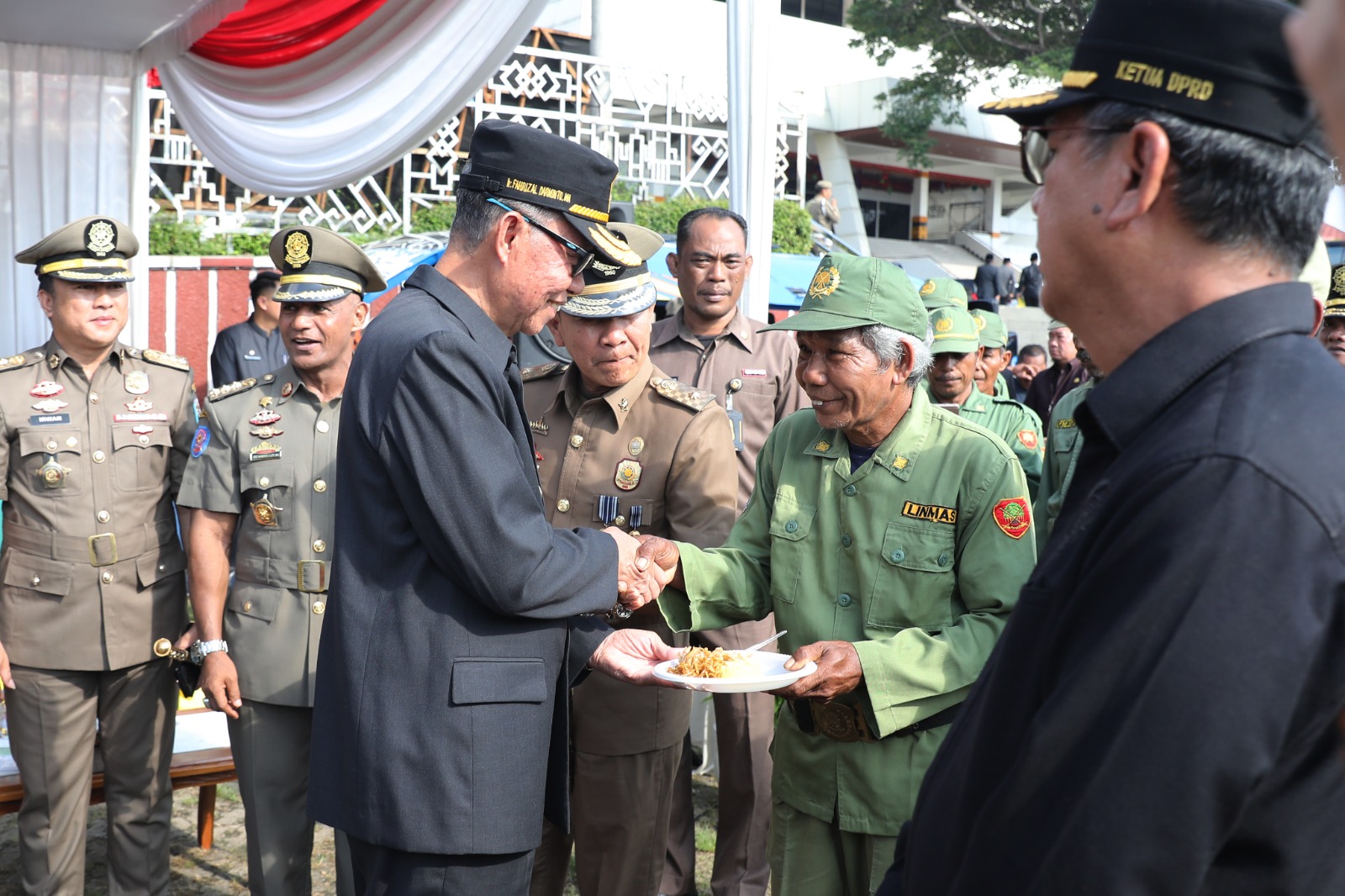 Dalam upacara ini dimeriahkan dengan pemotongan tumpeng dan turut pula diserahkan Piagam Penghargaan kepada Anggota Satlinmas yang telah memberikan pengabdian dengan masa bakti selama 30 tahun.