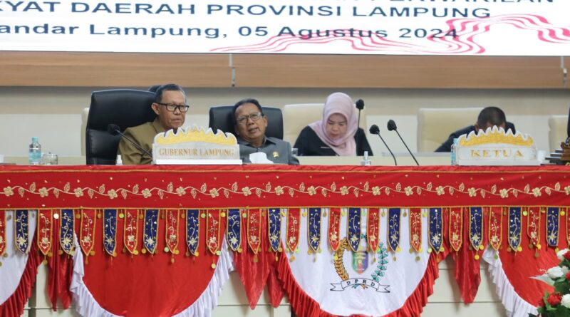 FAJARLAMPUNG.COM, Bandar Lampung – Sekretaris Daerah Provinsi Lampung Fahrizal Darminto dan jajaran anggota Forkopimda menghadiri Rapat Paripurna Penyampaian 6 Raperda usulan DPRD Provinsi Lampung terhadap penjelasan Pimpinan Badan Pembentukan Peraturan Daerah (Bapemperda) DPRD Provinsi Lampung, di Ruang Sidang DPRD Lampung, Senin (05/08/2024).