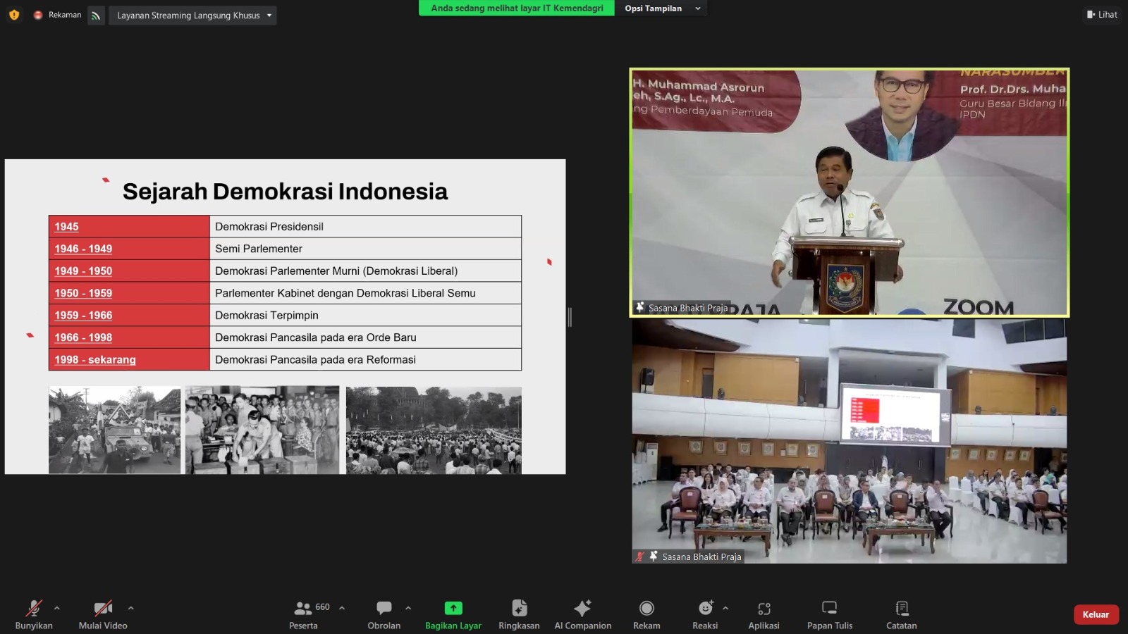 Sebagai informasi, webinar kali ini menghadirkan dua narasumber, yaitu Deputi Bidang Pemberdayaan Pemuda Kementerian Pemuda dan Olahraga (Kemenpora) Muhammad Asrorun Ni’am Sholeh yang hadir secara online, dan Guru Besar Bidang Ilmu Pemerintahan Institut Pemerintahan Dalam Negeri (IPDN) Muhadam Labolo yang hadir secara offline.(Wan)