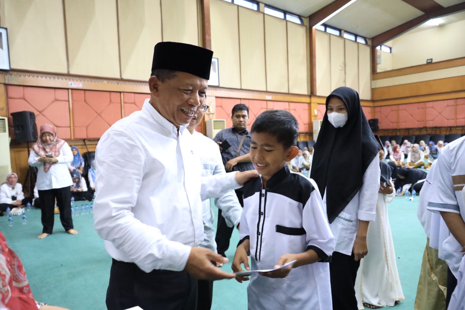 Sebanyak 30 anak yatim dari yayasan yatim dan 10 anak yatim aparatur di lingkup sekretariat daerah menerima santunan yang diberikan langsung PJ Sekda Kota Bekasi Junaedi didampingi Plh. Kabag Kessos dan para Kabag.