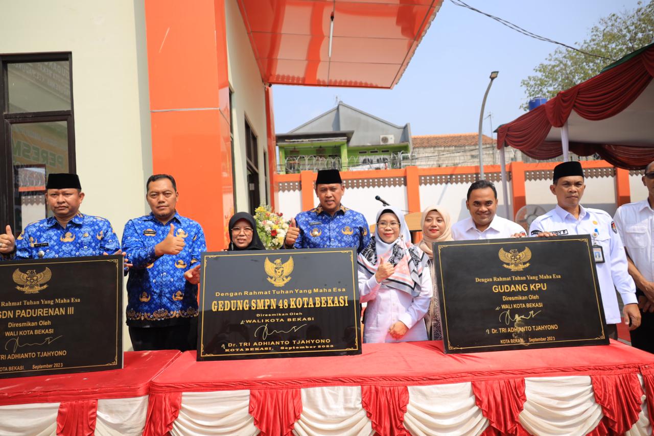 FAJARLAMPUNG.COM – Wali Kota Bekasi Dr Tri Adhianto meresmikan pengoperasian tiga gedung di wilayah Kelurahan Padurenan Kecamatan Mustika Jaya Kota Bekasi,Senin, (18/9/2023). Tiga bangunan ini terdiri dari Gudang KPU Kota Bekasi, sekolah SMP Negeri 48 Kota Bekasi dan SDN Padurenan tiga Kota Bekasi.