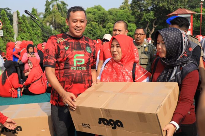 Dalam kegiatan yang diiringi senam bersama, Wali Kota Bekasi mengajak beberapa para ibu kader posyandu untuk menjawab pertanyaan dan mendapatkan souvenir berupa sepatu menarik.(wan)